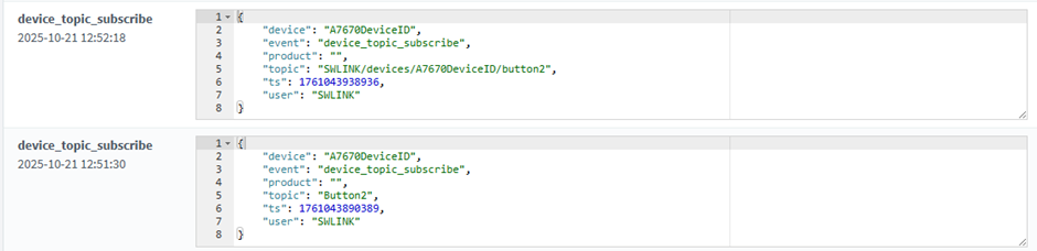 On MQTTX I have tried subscribing to “Button2” as well as to “SWLINK/devices/A7670DeviceID/Button2”. I can see the device topic describe events in the inspector.